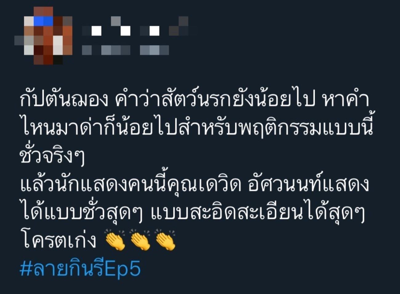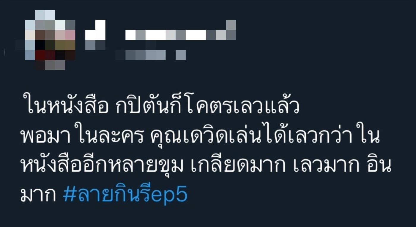 ใครที่ติดตามละคร “ลายกินรี” ช่อง 3 จะรู้เลยว่าตอนนี้เรื่องราวการสืบหาตัวผู้ฆ่า กปิตันฌอง กัปตันเรือชาวฝรั่งเศส สามีของมาดามคลาร่า ต่างเป็นไปอย่างเข้มข้น แถมยังเดิมพันด้วยแผ่นดิน ล่าสุดเนื้อหาในละครก็ได้เล่าย้อนไปตอนที่ กปิตันฌอง ยังมีชีวิตอยู่จากการให้ปากคำของผู้ที่เกี่ยวข้อง บอกเลยว่าเมื่อตอนเขายังมีชีวิตอยู่ร้ายมาก ถึงขั้นเลวเลย จึงเป็นสาเหตุที่ทำให้คนดูเดาทางไม่ถูกว่าใครคือฆาตกรกันแน่ เมื่อคนดูเห็นซีนกปิตันฌองชั่วร้ายทำร้ายผู้อื่น ถึงกับอินหนักด่าตัวละครนี้แบบไม่ยั้ง พร้อมชื่นชม ปรบมือให้ “เดวิด อัศวนนท์” ที่ถ่ายทอดความเป็น “กปิตันฌอง” ออกมาได้ถึงเครื่อง ร้ายจนน่ากลัว