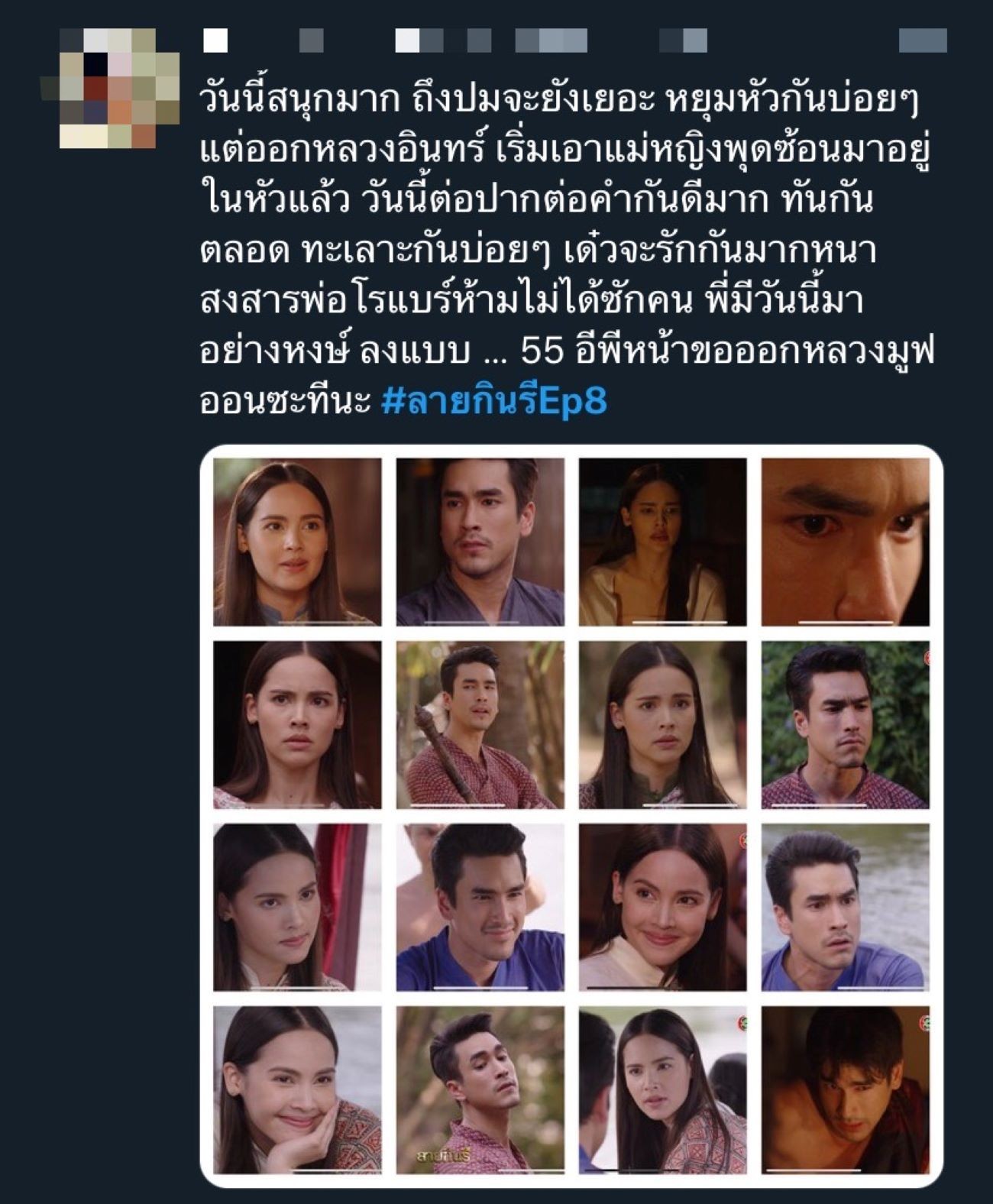 มาถึงเรื่องที่ทุกคนอยากรู้ที่สุดและลุ้นไม่ต่างจากการหาตัวฆาตกรคือ “แม่หมอพุดซ้อน” กับ “หลวงอินทร์” จะดีกัน รักกันได้เยี่ยงไร ในเมื่อเจอกันทีไรก็ทะเลาะกันตลอด ผู้จัดละคร “บีบี เอกนรี” ให้สัมภาษณ์ว่า “ความจริงเขาอาจจะมีความรู้สึกกันลึก ๆ แต่ไม่รู้ตัว อาจจะไม่ได้โฉ่งฉ่างหวานซึ้งอะไร เพราะตัวพระเอกเขาก็มีปมเรื่องภรรยาที่ตายไปด้วย อาจจะไม่ได้เปิดใจร้อยเปอร์เซ็นต์ แต่ก็ดูออกแหละว่าหวงหึงเขา อาการก็ออก และพอทุกคนได้ดู EP.8 ก็จะเห็นชัดเจนว่า เอ๊ะอาการออกแรงขึ้น ๆ เลยนะ แค่ปากแข็ง อยากให้ติดตาม ลายกินรี กันเยอะ ๆ เพราะว่าเรื่องราวเข้มข้นชวนลุ้นจนจบเรื่องเลย ที่เห็นว่ามีตัวละครโผล่มาเรื่อย ๆ ยังมีมาอีกนะ ก็ต้องไปรอลุ้นกันในละครค่ะ”
