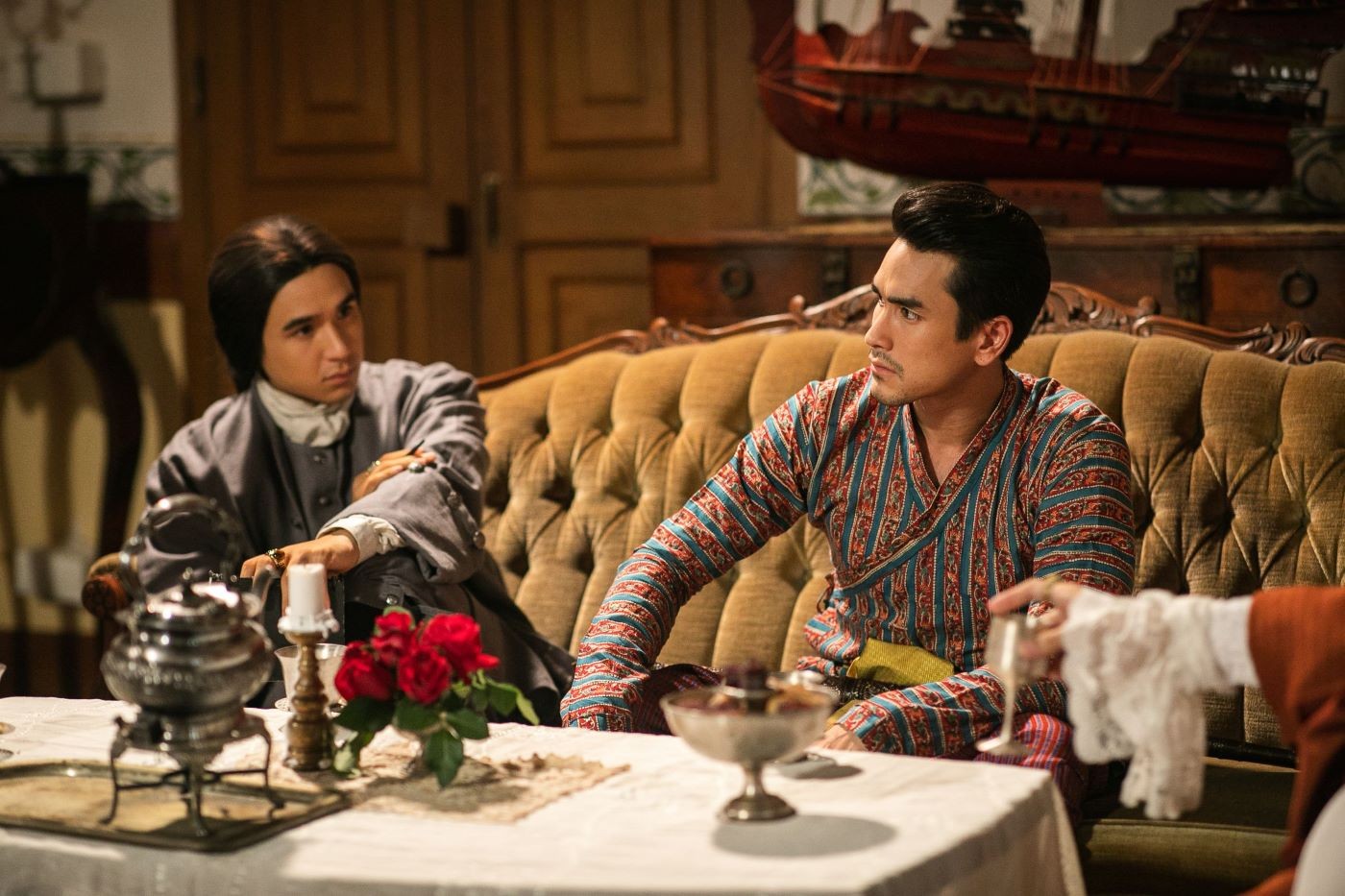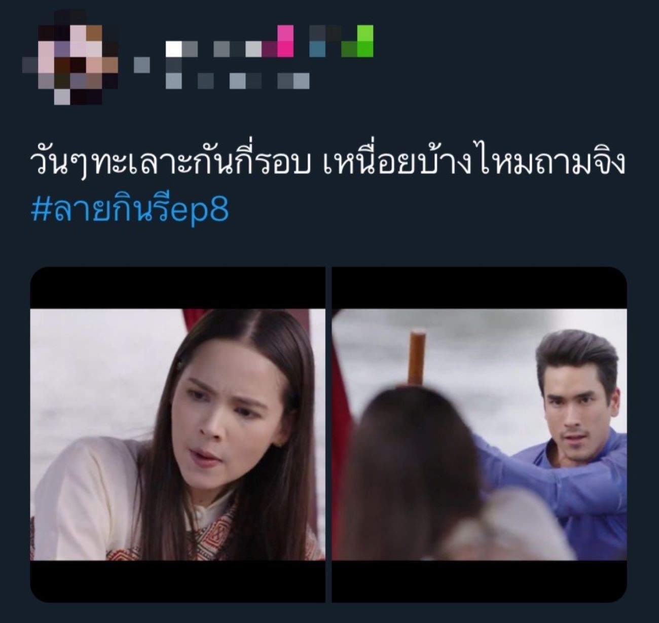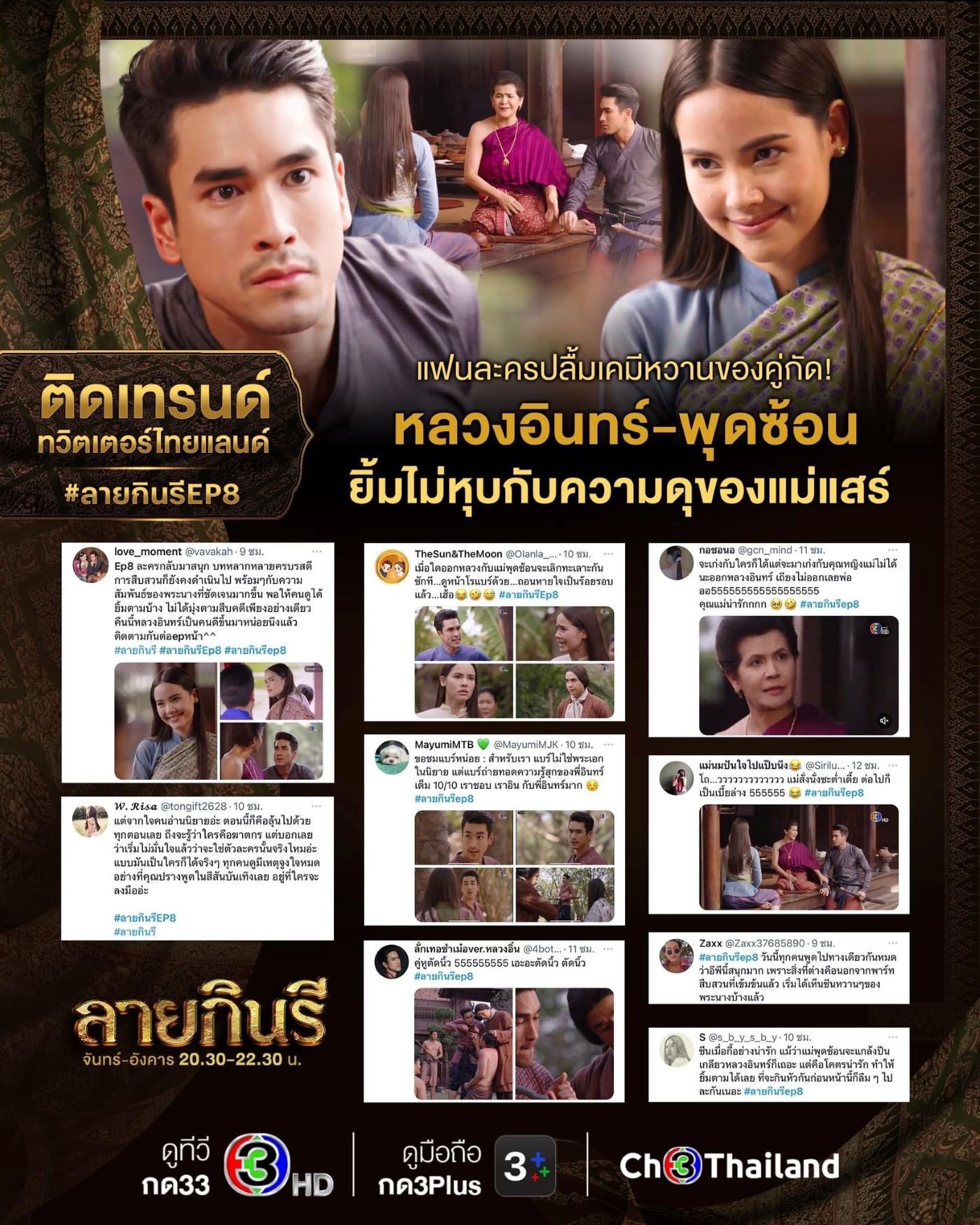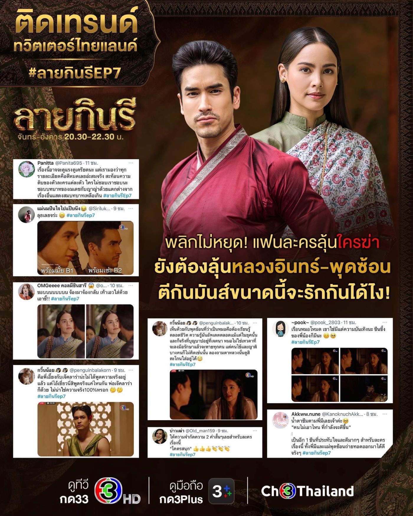 3 นักสืบอโยธยา แม่หมอพุดซ้อน (ญาญ่า อุรัสยา) หลวงอินทร์ (ณเดชน์ คูกิมิยะ) และ โรแบรต์ (นิว ชัยพล) จากละคร “ลายกินรี” ช่อง 3 ยังคงทำงานหนัก ตามสืบหาความจริงว่าใครคือผู้ฆ่า กปิตันฌอง (เดวิด อัศวนนท์) การให้ปากคำของแต่ละคนก็น่าปวดหัวสุด ๆ ต่างเล่าเรื่องเกี่ยวกับกปิตันฌองไม่ตรงกัน ไม่ว่าจะเป็น กปิตันปอล (ทวีศักดิ์ ธนานันท์) เชี่ยว (แคร์ วงศ์วชิรา) เอี้ยง (มะปราง กุลภัสสรณ์) ออกหลวงโกชา (กระดุม ธนายง) หรือ มาดามคลาร่า (เดียร์น่า ฟลีโป) ซ้ำยังโยนความผิดให้กันไปมา คนดูต่างลุ้นว่าใครพูดจริงพูดเท็จ และล่าสุดก็มีเรื่องเซอร์ไพรส์ มาดามคลาร่าตั้งท้อง ทุกคนจึงพากันสงสัยหนักมากว่าใครเป็นพ่อของลูกในท้อง ฟากฝั่งในวัง เจ้าจอมกินรี (พิ้งกี้ สาวิกา) กับ ช้อย (ปู ปริศนา) ก็พยายามเอาผ้าลายอย่างคืนถึงขั้นฆ่าคนตาย แต่กลับไม่ได้คืน เพราะ เจ้าจอมสารภี (เจี๊ยบ กาญจนาพร) คิดแผนตลบหลัง คนดูพากันตบมือให้ความฉลาดของเจ้าจอมสารภีรัว ๆ เรื่องราวในละครสนุก พลิกไปพลิกมา ได้กระแสตอบรับที่ดีจากแฟน ๆ โซเชียลทั้งหลาย จน #ลายกินรีep7 และ #ลายกินรีep8 ติดเทรนด์ทวิตเตอร์ไทยแลนด์