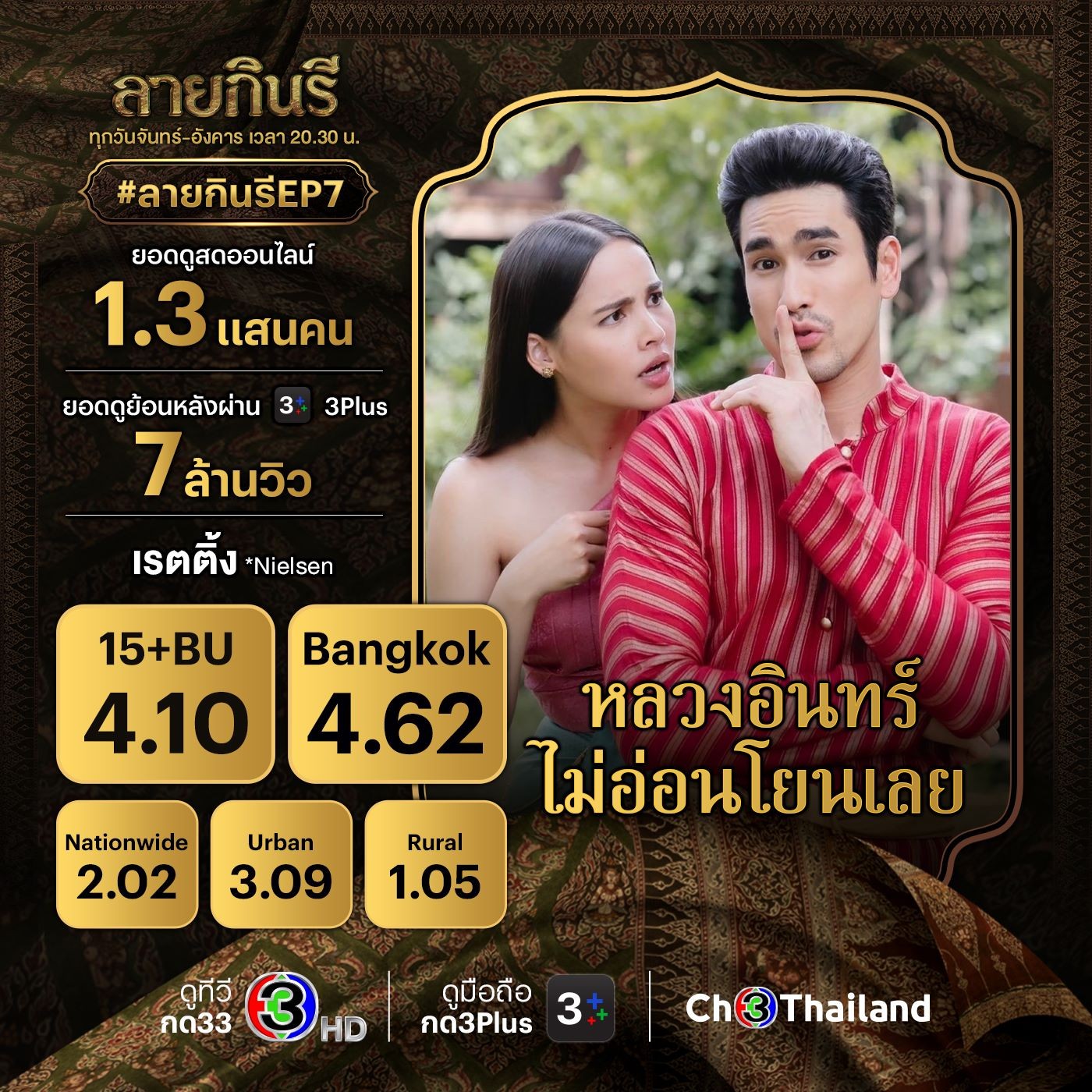 ตามลุ้นหาตัวฆาตกรและลุ้นกันว่า “แม่หมอพุดซ้อน” กับ “หลวงอินทร์” จะดีกันเมื่อไหร่ในละคร “ลายกินรี” ทุกวันจันทร์-อังคาร เวลา 20.30 น. ทางช่อง 3 ดูทีวีกด 33 ดูมือถือกด 3Plus และดูย้อนหลังครบทุก EP. รวมถึงไฮไลท์และเบื้องหลังฉากหลุด แบบฟินจัดเต็มได้ที่ https://ch3plus.com/drama/1371