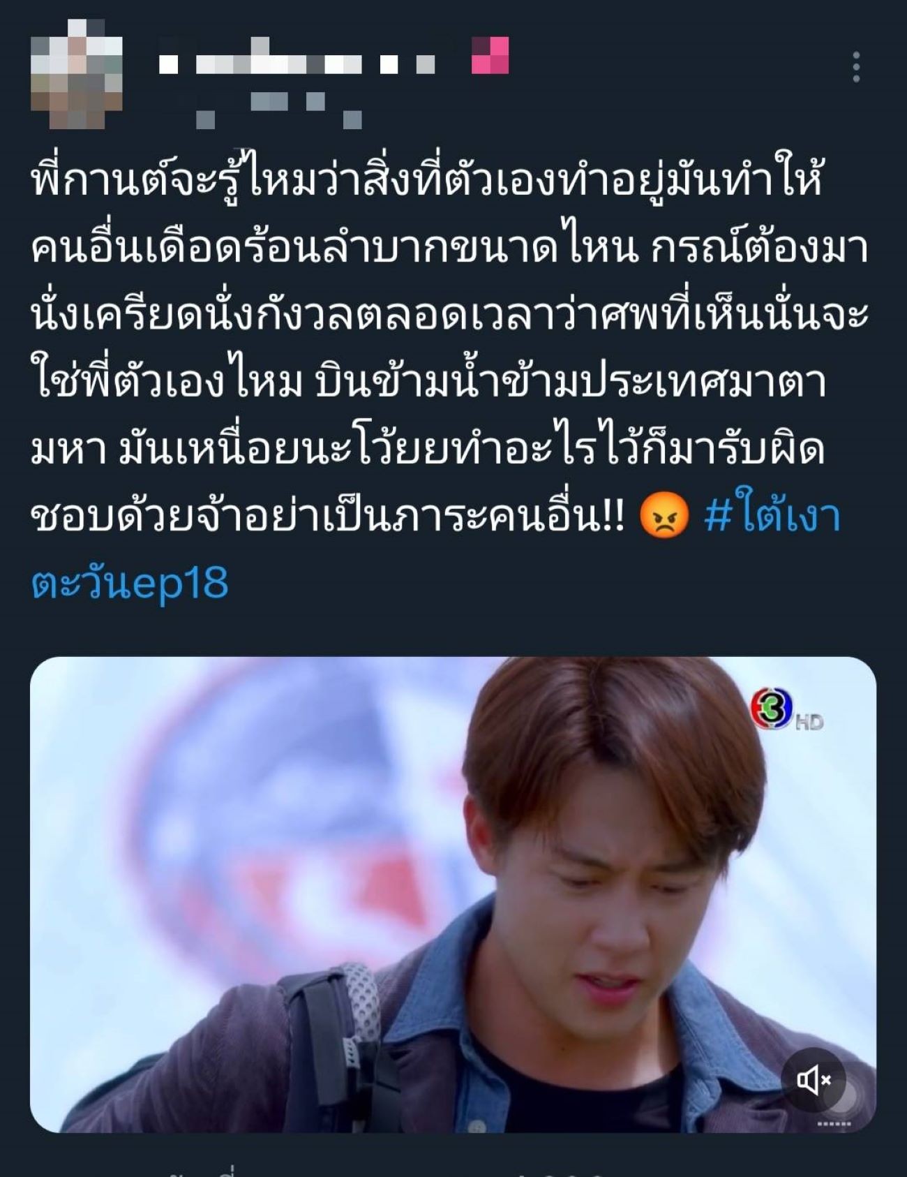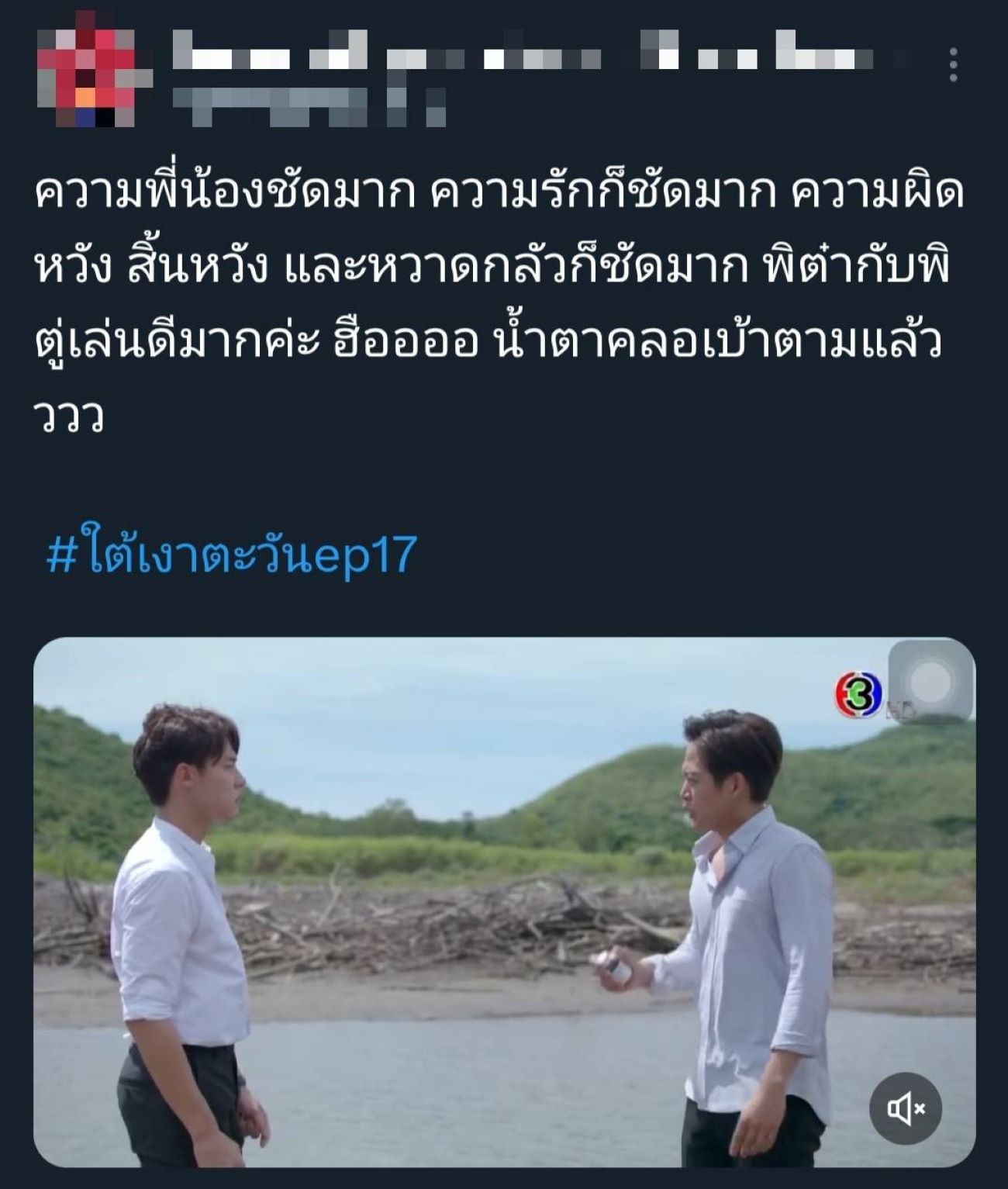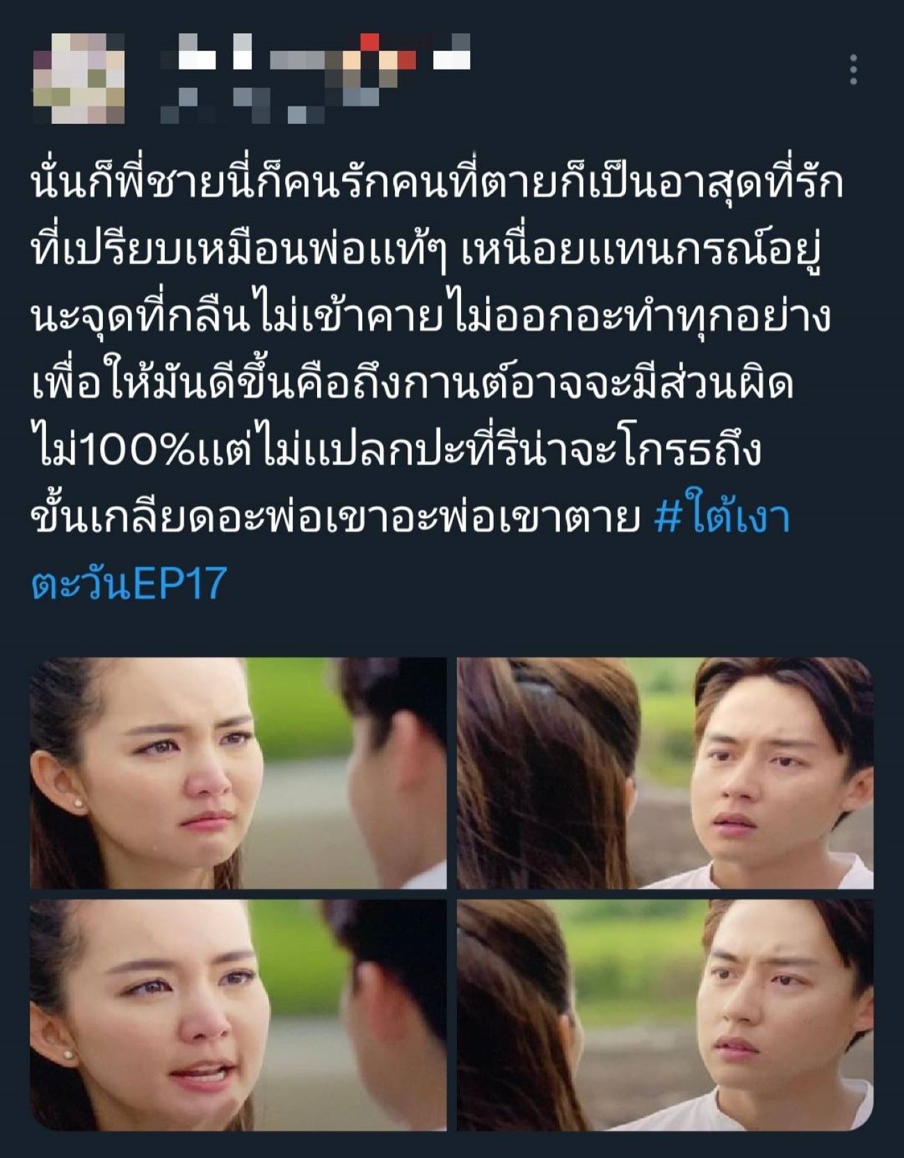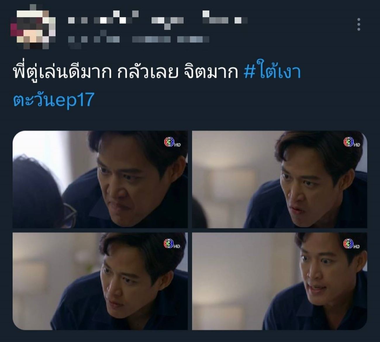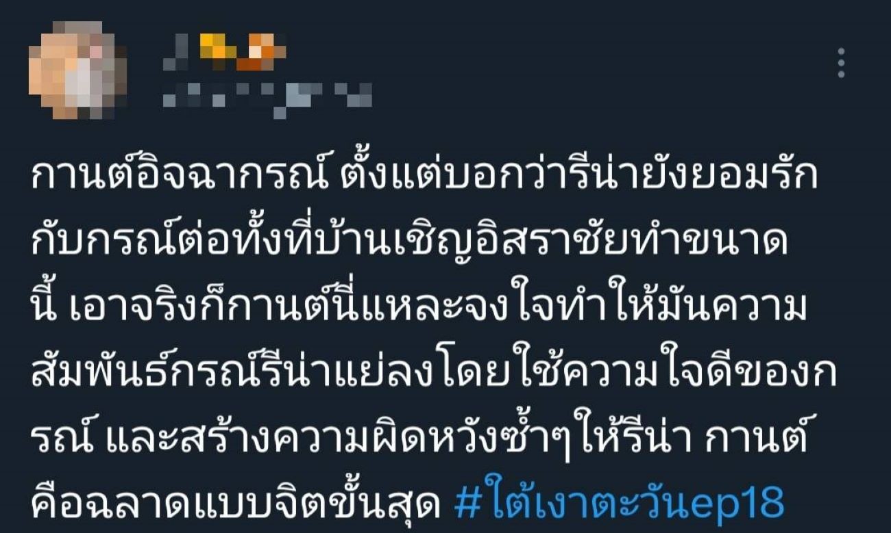 แรงตั้งแต่เริ่มจนถึงช่วงโค้งสุดท้ายละคร “ใต้เงาตะวัน” ช่อง 3 ที่ตอนนี้ความเข้มข้นหนักหน่วงชวนลุ้นตาไม่กะพริบ ทำเอาฟีดแบ็กดีเกินคาด และยอดดูสดออนไลน์ยังพุ่งขึ้นอีกด้วย ล่าสุดเหลืออีกแค่ 2 ตอนสุดท้ายแล้ว ความจริงต่าง ๆ และความสัมพันธ์ของแต่ละครอบครัวใกล้ถึงบทสรุปเต็มที ไม่ว่าจะเป็นครอบครัว เกรียง (บิ๊ก ศรุต) ก๋า (อันดา กุลฑีรา) วิลาวัณย์ (เต๋า สโรชา) หรือ กรณ์ (หมาก ปริญ) กานต์ (ตู่ ภพธร) เกียรติ (นก ฉัตรชัย) หรือความรักของคู่พระนาง กรณ์ กับ รีน่า (โบว์ เมลดา) ที่เดี๋ยวหวานเดี๋ยวขม เพราะมีเรื่องให้ระเบิดอารมณ์ใส่กรณ์ตลอด ล่าสุดรู้ว่ากานต์อาจจะเป็นคนที่วางยาพ่อฉาย (เกม ศานติ) ทำให้รีน่าเอ่ยปากเลยว่า “เราจะรักได้ยังไง ในเมื่อพี่ชายของคุณเป็นฆาตกร” ส่วนตัวปัญหาอย่างกานต์ที่พยายามฆ่าตัวตายเพื่อหลบหนีความผิด จู่ ๆ ก็โผล่มาสร้างเรื่องระทึกอีกครั้ง ซ้ำยังหนักข้อกว่าเก่า เพราะกลับมาปั่นหัวน้องชายแทน ทำเอาโซเชียลสงสารกรณ์กับรีน่า หันมารุมหยุมหัวกานต์ตัวสร้างปัญหากันกระหน่ำ จนติดแฮชแท็ก #ใต้เงาตะวัน ของแต่ละอีพีทั่วแพลตฟอร์มออนไลน์