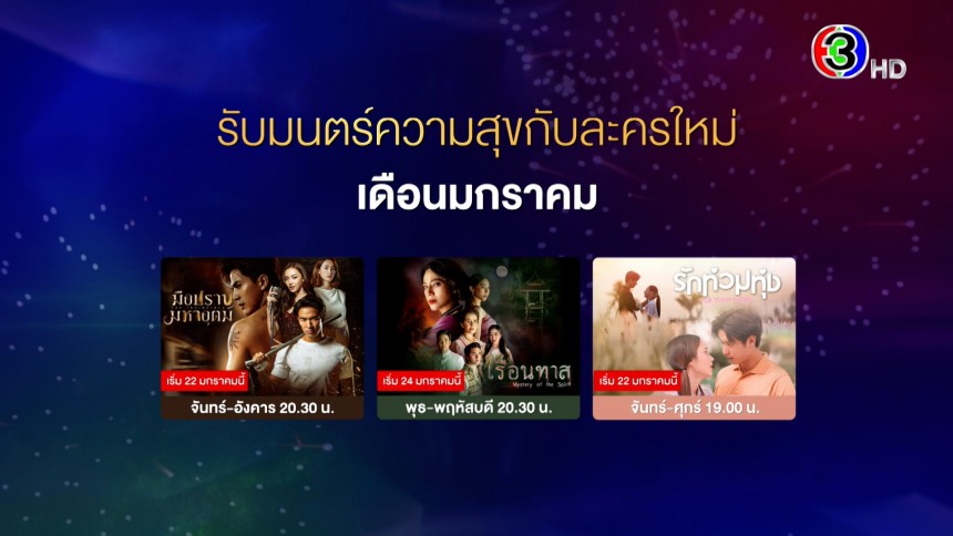 ร่ายมนตร์ความสนุกรับปีใหม่ พบความสนุกครั้งใหม่กับ ละครใหม่ช่อง 3 จันทร์- อังคาร ร่ายคาถาบู๊สนุกสุดมันกับ #มือปราบมหาอุตม์ เริ่ม 22 ม.ค. พุธ-พฤหัสบดี เสกมนตราปริศนาวิญญาณแค้นใน #เรือนทาส เริ่ม 24 ม.ค. เย็นวันจันทร์-ศุกร์ วาดรอยยิ้มสนุกรักปนฮากับ #รักท่วมทุ่ง เริ่ม 22 ม.ค. เปิดตัวความสนุกครบรสพร้อมกัน เดือนมกราคมนี้ที่ช่อง 3